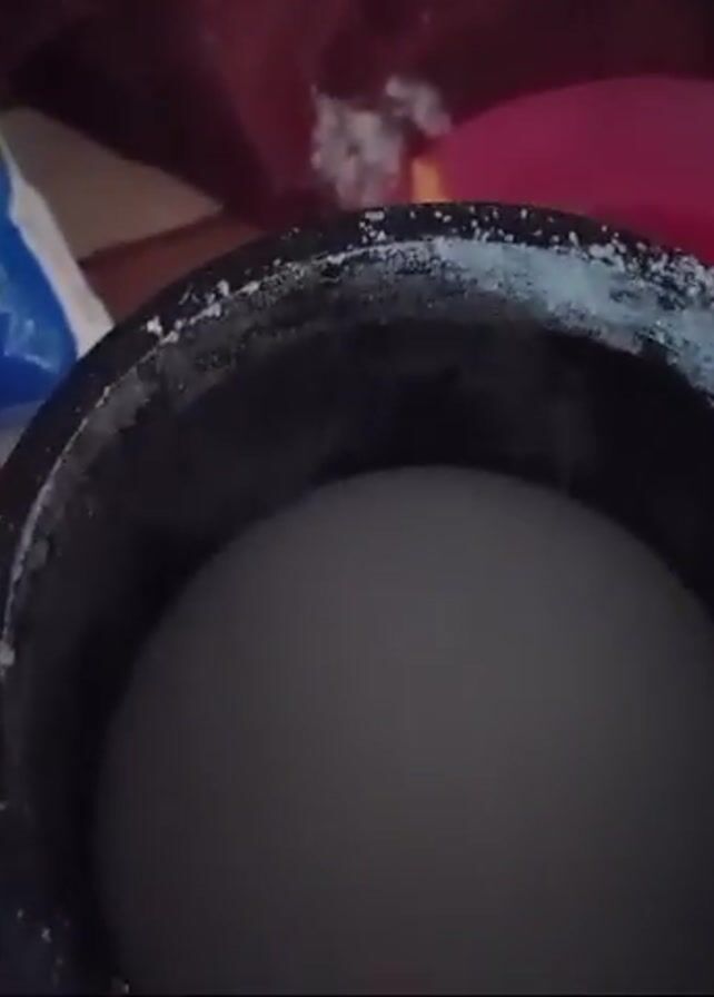 person preparing a banana-based dessert. A bag of cake mix labeled "Una Delicia" sits next to a ripe banana and a black bowl containing a white liquid. A hand places the banana into a pot with a batter-like substance. The camera focuses on the pot as the banana is mixed into the batter.