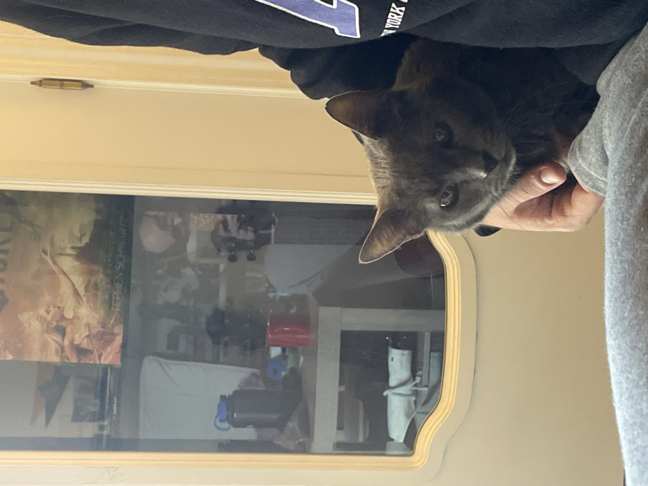 - "An indoor scene features a gray domestic shorthair cat held by a person" by FM-E8Nbf1, licensed under CC BY 4.0