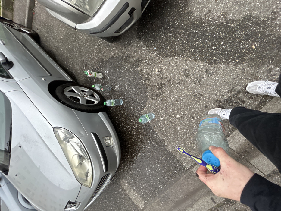 The image captures a ground-level view of an outdoor scene in Strasbourg, France, on wet, dark asphalt. The front section of a silver Peugeot 407 sedan occupies the upper left, displaying its bumper, left headlight, and a portion of the hood and fender, along with a multi-spoke alloy wheel. Partially visible on the far right is the front bumper and headlight of another silver vehicle, consistent with a Renault Clio III. On the asphalt near the front of the Peugeot, five plastic bottles are present. Four are clustered: three clear plastic water bottles (two upright with green and blue caps, one partially filled or overturned), and a white plastic bottle labeled as windshield washer fluid. A fifth clear plastic water bottle with a green cap is situated further on the asphalt. In the immediate foreground, from a first-person perspective, a person's lower torso, legs, and feet are visible, wearing black pants and white sneakers with grey accents. The person's right hand, exhibiting dark smudges, holds a large, clear plastic bottle with a blue cap. A blue and yellow toothbrush is inserted into the opening of the bottle being held.
