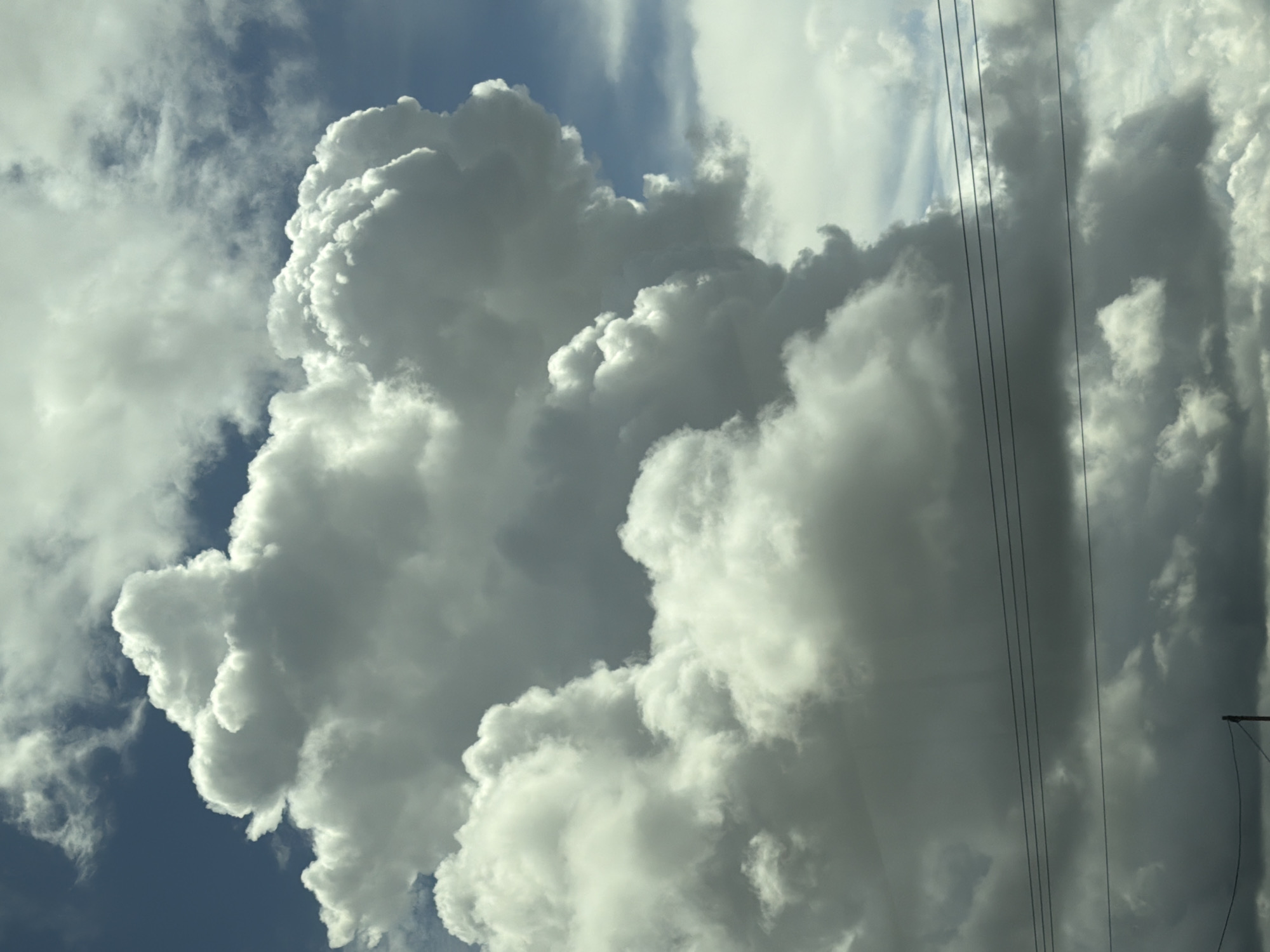 The image displays a sky scene over Kiryat Gat, Israel. Dominating the upper and central portions are large, bright white cumulus clouds, exhibiting significant vertical development and distinct, rounded contours. Interspersed among these and visible in the background are patches of clear, light blue sky. Towards the lower third of the image, the clouds appear darker and grayer, suggesting a greater depth or less direct sunlight penetration. Horizontally spanning across the lower half of the frame are five parallel, dark-colored power lines. A section of a dark utility pole is visible at the bottom center, extending upwards from off-frame, supporting the lowest of these wires. No individuals or specific ground features are discernible beyond the utility infrastructure.