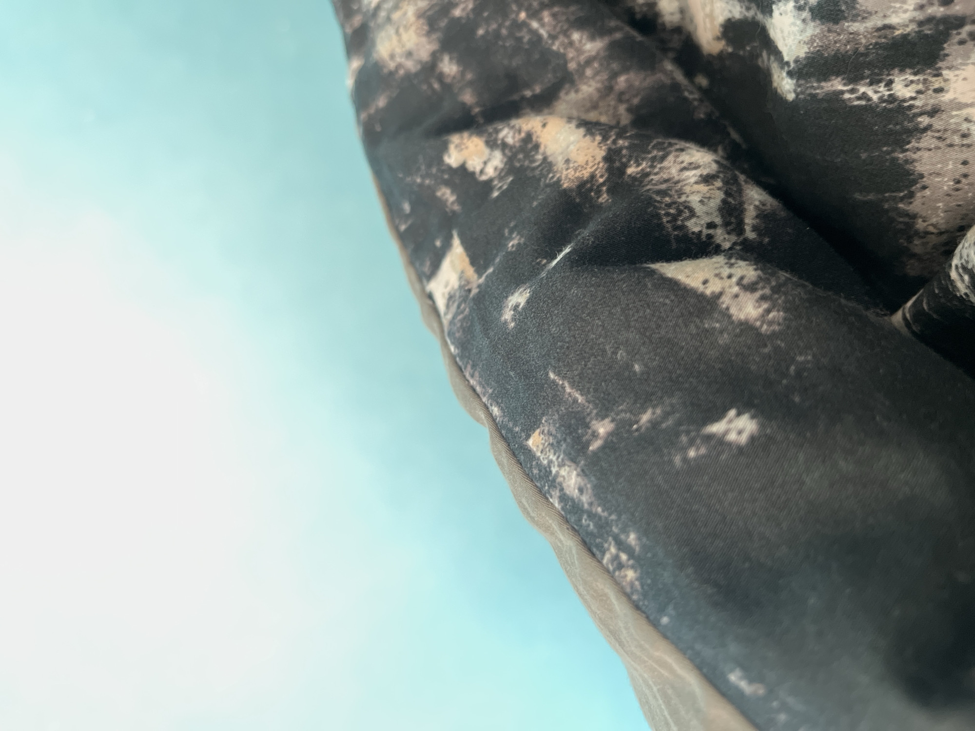 close-up of a camouflage-patterned fabric, likely clothing or upholstery, with a black, brown, and tan mottled design