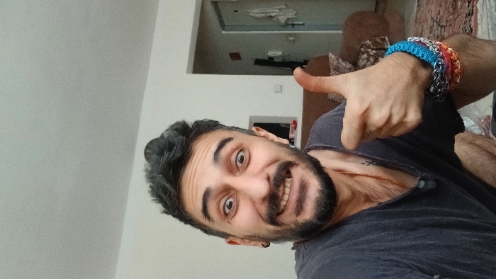 A man poses with a wide smile, his face turned slightly to the side. He has dark hair with some graying, a thick mustache and beard, and noticeable wrinkles. He wears a dark gray shirt. His left hand is raised, giving a thumbs-up, and several colorful chain bracelets adorn his wrist. The background includes part of a room with a doorway, a sofa, and a light-colored wall.