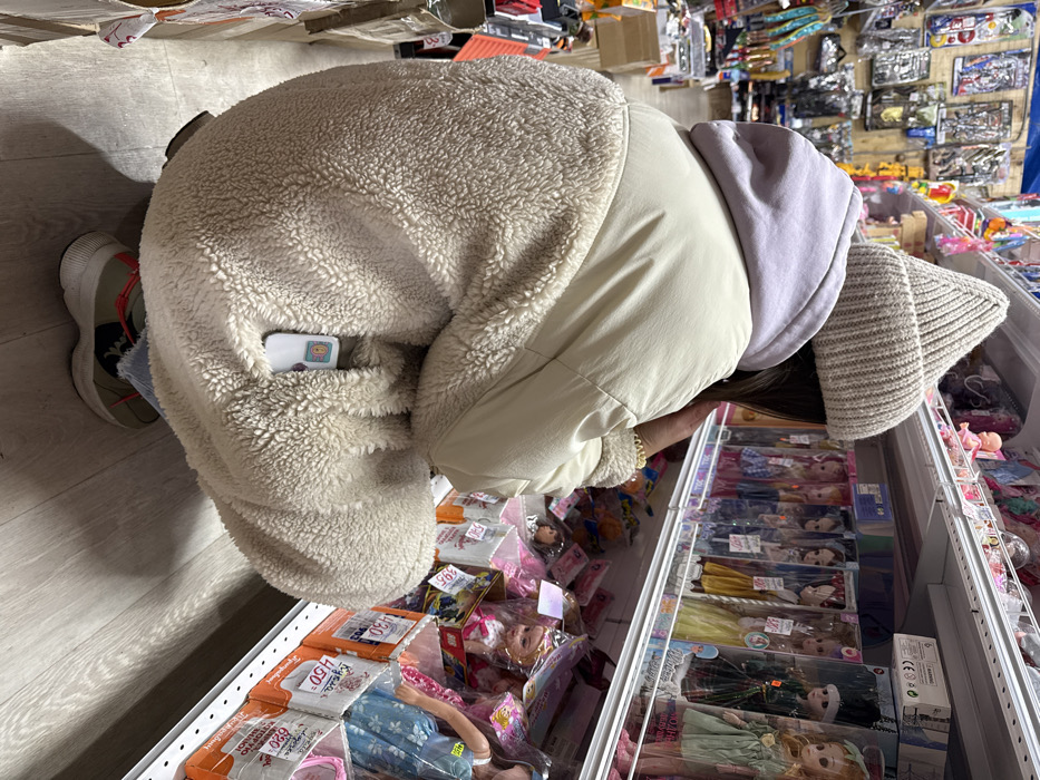 A person wearing a beige, woolly jacket, a lilac hoodie, and a knitted hat is leaning over a refrigerated display case filled with dolls in boxes. The dolls are mostly encased in plastic and arranged in rows, showcasing various designs and colors of dresses. The person is inspecting the dolls, likely considering a purchase. The background shows more merchandise and other retail items in the store.