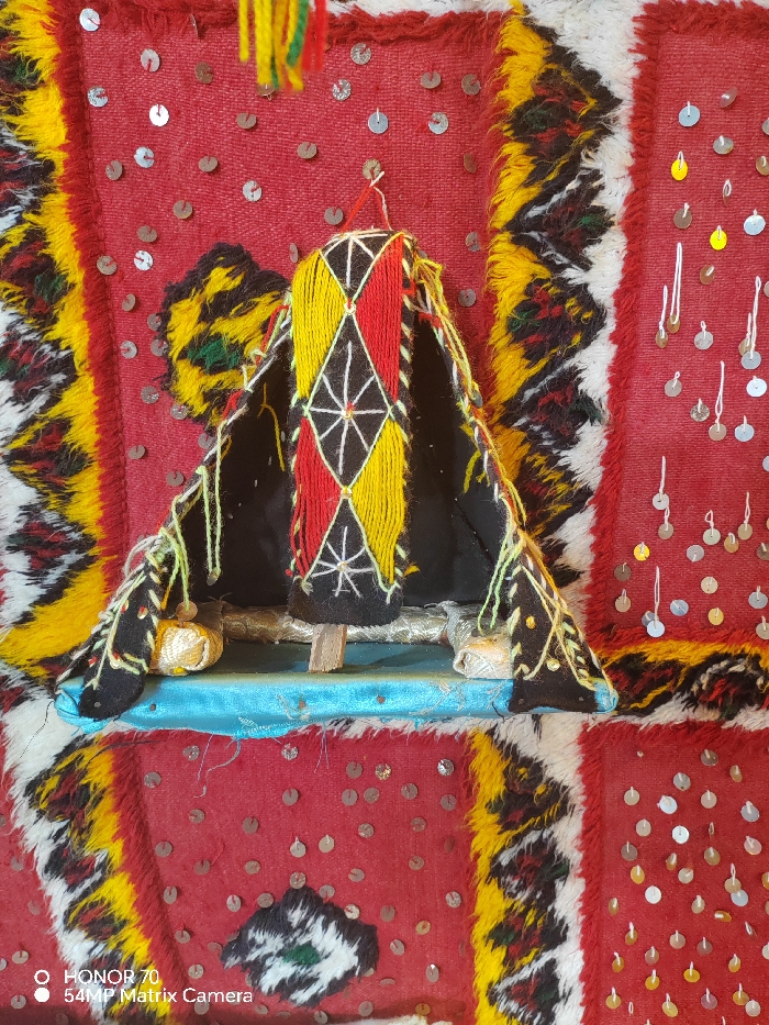 A triangular decorative piece is centered on a red and white patterned backdrop adorned with scattered sequins. The piece is a miniature tent-like structure, crafted with black fabric and embellished with yellow, red, and white geometric yarn designs. It rests on a turquoise platform supported by a small wooden stick. Miniature balls of yarn sit on either side of the tent. A tassel of red, yellow, and green yarn is at the top.
