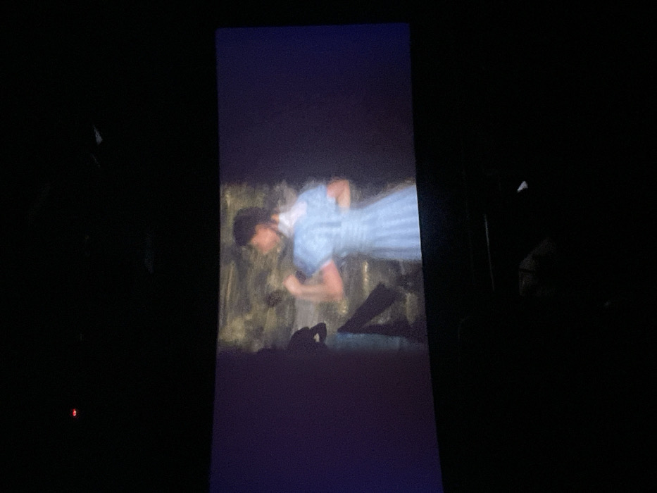 scene from a movie or play projected onto a screen. A woman in a light blue dress is on the screen, bent over with her fists clenched. Behind her is a blurred background of what appears to be a wall or foliage. Below her, at the bottom of the screen, are indistinct shapes suggesting objects or other figures. The screen is surrounded by darkness, likely indicating it was taken inside a theater.