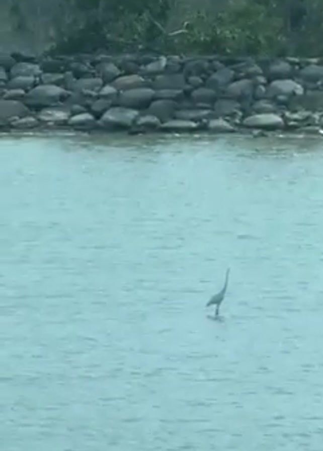 A gray heron stands in shallow, light blue water. Behind the heron is a bank of rocks and foliage.