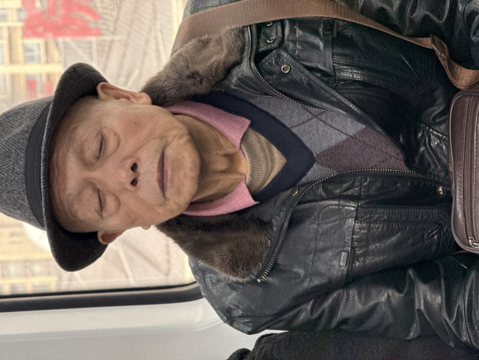 An elderly person wearing a gray hat sleeps, their head tilted. They have a pink collared shirt, an argyle sweater, and a black leather jacket with a fur-lined collar. A brown bag strap is visible over their shoulder. The background is blurry and suggests an urban setting. The person appears to be resting while traveling, possibly on public transportation.