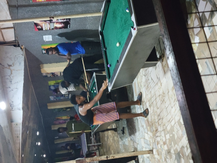 A group of men are playing pool in an indoor establishment. One man is in the process of taking a shot at the pool table. The pool table is green with several balls. The room's decor includes posters on the wall. The floor is covered in a mosaic-style tile. A wooden structure is partially visible on the right side of the frame.