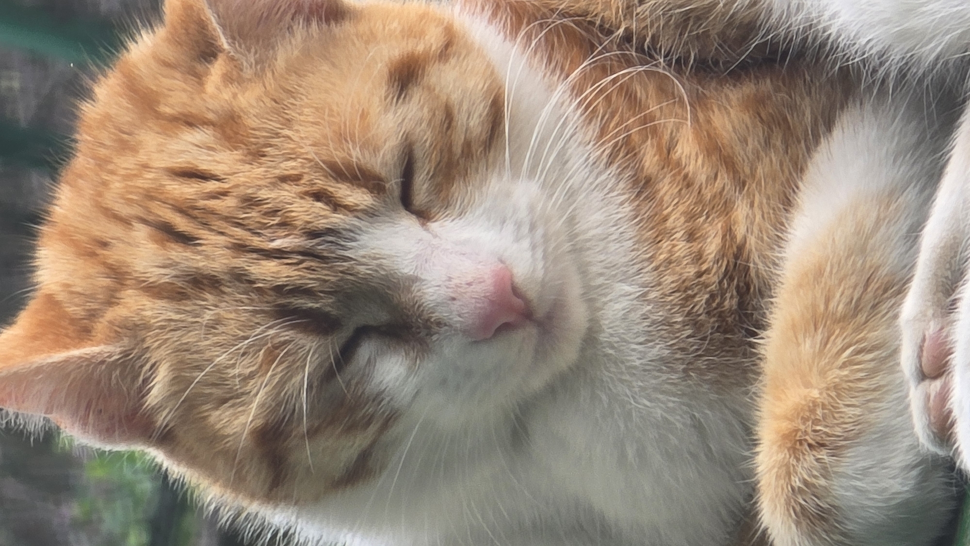 A domestic feline, identified by its orange and white bicolor fur pattern with tabby markings, is depicted in a close-up, vertical composition. The subject is observed in a state of rest or sleep, with both eyes closed. The fur on the head and ears is predominantly orange with darker tabby stripes, while the muzzle, chest, and lower part of the face are white. A distinct pink nose is centered on the muzzle, and multiple long, white vibrissae (whiskers) extend from both sides of the muzzle. A portion of a front paw, displaying pink paw pads, is visible at the bottom of the frame. The background is out of focus, showing blurred green and dark tones, indicative of foliage or an outdoor environment. The scene is located in Izvorche, Bulgaria.