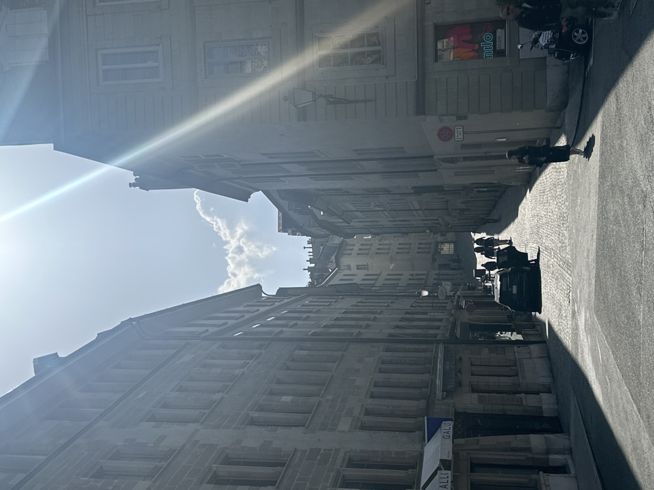 This image depicts a narrow, ascending cobblestone street lined with multi-story stone buildings under bright sunlight in Geneva, Switzerland. The architecture suggests the *Vieille Ville (Old Town)*, likely a street such as Rue du Puits-Saint-Pierre. The street slopes uphill from the foreground into the distance. The sky is bright blue with a prominent sun in the upper center, casting strong rays and lens flare, and creating deep shadows across the street and buildings. A few white cumulus clouds are visible. On the left, a tall stone building features multiple windows and, at ground level, signs for "GALLI" shops with white awnings. Further up the street on the left, a traditional black streetlamp extends from the building facade. On the right, another stone building displays a "NILO & Co" sign and clothing in a window display at street level. A decorative black streetlamp is mounted on this building, below a visible red circular no-parking sign with a diagonal line on a pole. A black scooter/moped is parked near the curb on the right. Approximately seven to nine individuals are present. In the foreground on the right, a person in dark attire walks towards the viewer, partially in shadow. Another person is partially visible further right, near the parked scooter. Further up the cobblestone street, a dark-colored SUV is parked on the left side. Behind and around the SUV, a group of five to seven people are walking uphill, away from the viewer, largely obscured by shadows and distance. One person appears to be emerging from behind the parked SUV.