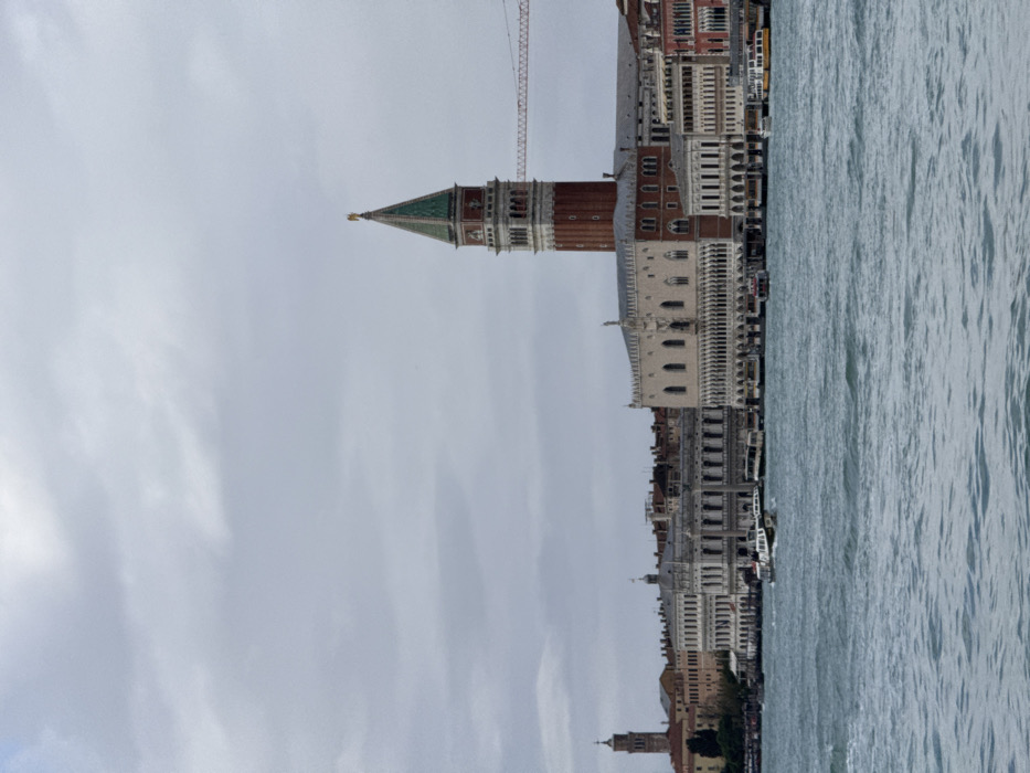 The image displays the waterfront of St. Mark's Basin in Venice, Italy, beneath an overcast, light grey sky. The distant shoreline is dominated by the St. Mark's Campanile, a tall reddish-brown brick tower with white upper tiers, a green pyramidal spire, and a golden finial, alongside the white Gothic Doge's Palace to its left, characterized by arcaded levels. A continuous array of multi-story historical Venetian buildings, predominantly light-colored, lines the water's edge, with another smaller bell tower visible further to the left. The foreground features choppy, blue-green water. Multiple vessels are present: one white motorboat moves left in the mid-ground, and several other watercraft, including larger white and yellow-and-black boats resembling vaporetti, are moored along the quay. No distinct human figures are visible. A red and white construction crane boom extends horizontally behind and to the right of the St. Mark's Campanile.