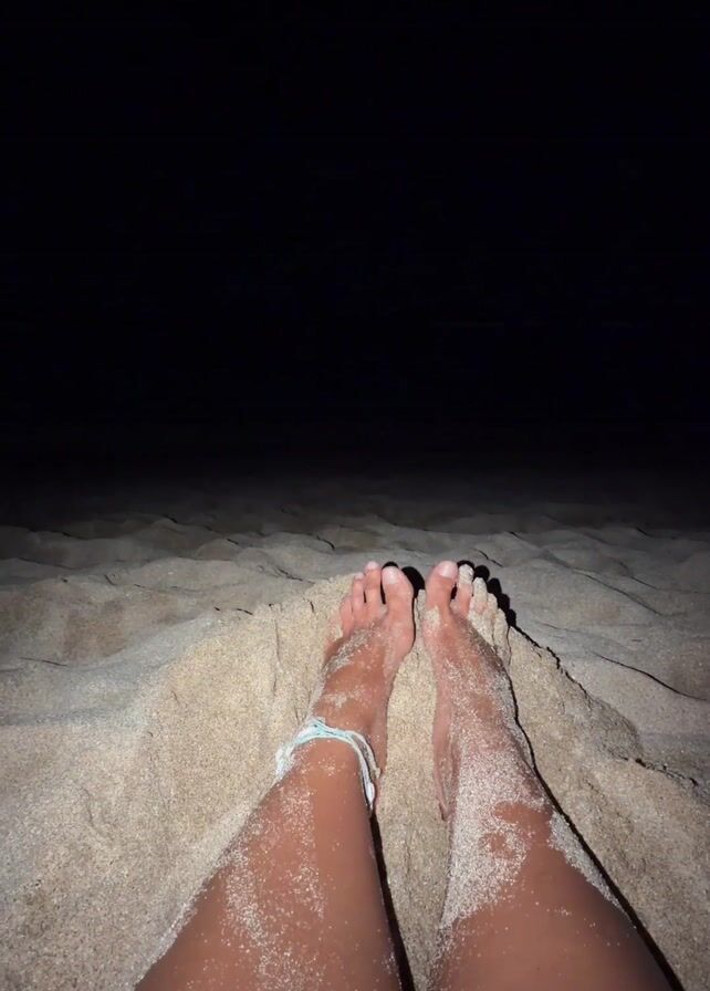 A pair of legs and feet covered in sand are visible in the foreground, with an anklet on one ankle. The background is dark, suggesting nighttime. Sandy ground surrounds the legs, and a green bottle is briefly visible in the bottom left corner. The legs and feet are oriented towards the dark horizon.