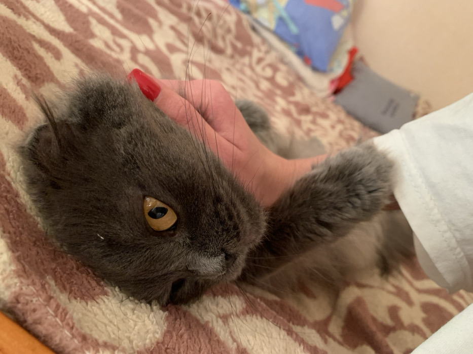 A dark gray-furred cat with amber eyes, likely a Scottish Fold due to its partially visible folded ears, is depicted in an indoor setting. A light-skinned human hand, featuring red nail polish on its fingers, gently supports the cat's head from beneath its jawline. The cat's gaze is directed off-frame to the left. Its right front paw is visible, resting against the cuff of a white long-sleeved garment worn by the human. The cat and hand are situated on a beige blanket with abstract, wavy patterns. The blurred background contains additional fabric elements with blue, white, and red patterns, along with a gray object. The image provides no discernible features to confirm the specified location in Bohuslav, Ukraine.
