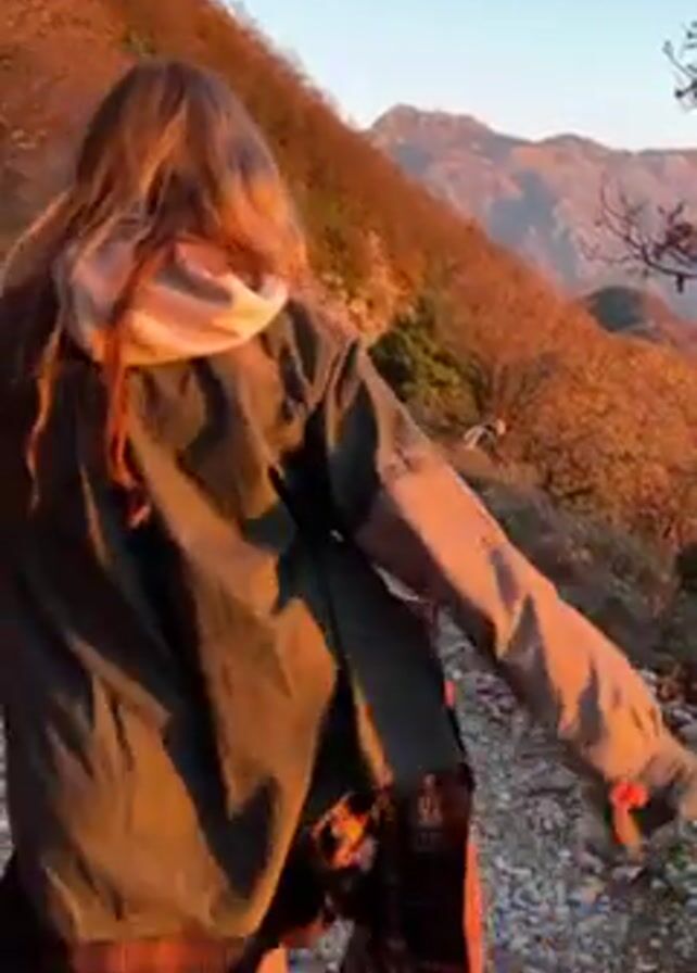 A young woman is walking along a rocky path on a mountainside. The path is on a steep slope with trees and shrubs on both sides. The leaves on the trees are turning orange and red. In the distance, there is a tall mountain range. The woman is wearing a jacket, a plaid shawl, and shorts. She stops and spins around. The time of day appears to be either dawn or dusk, and the setting sun casts a warm glow on the landscape. Another person is walking in the distance.
