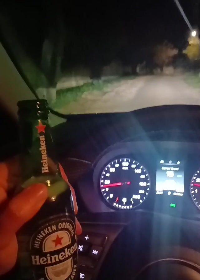 dashboard of a car driving at night on a narrow road lined with trees. The driver is visible through the steering wheel, and the dashboard gauges are illuminated. Streetlights provide minimal illumination. The car's navigation system is displaying music information.