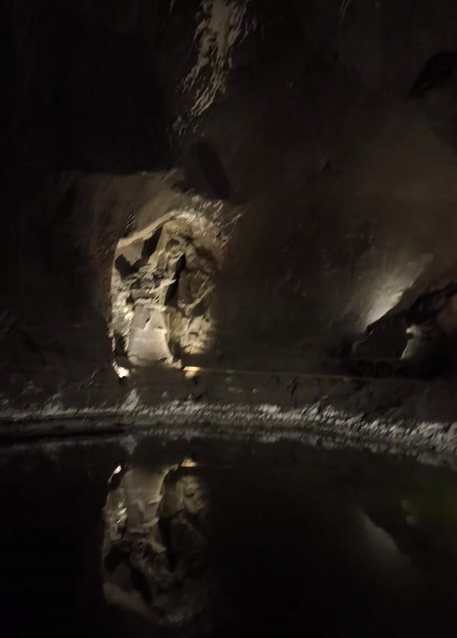 The camera is tilted up at the dark, rocky interior of what appears to be a cave or tunnel