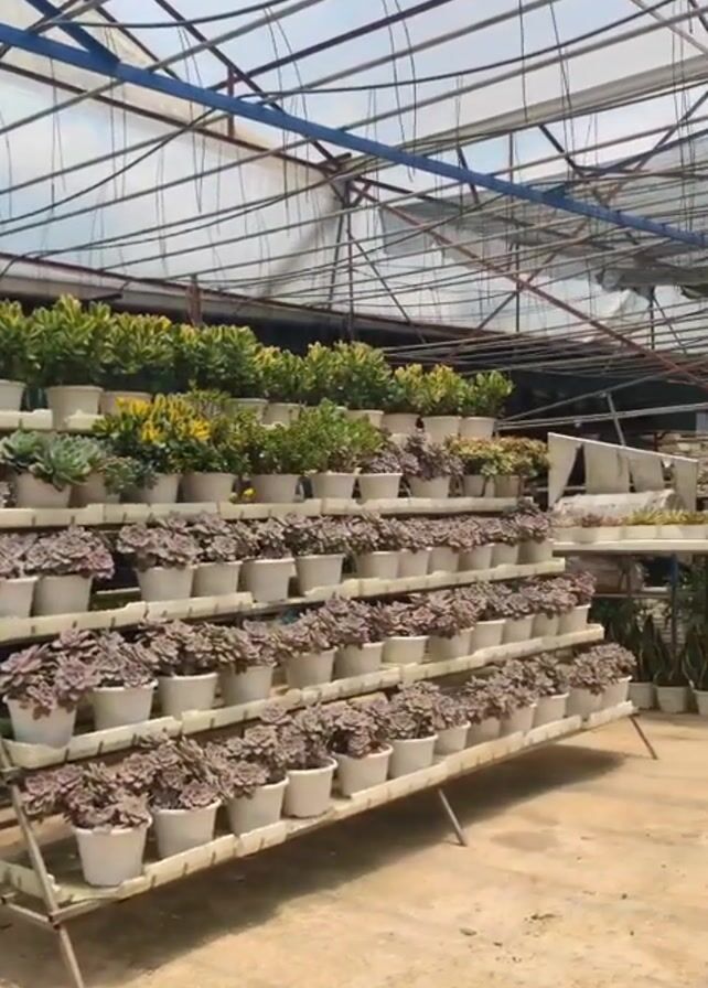 interior of a large greenhouse. A tiered metal structure fills the left side of the frame, supporting numerous white pots containing small, leafy plants. The upper tiers feature plants with yellow accents. The greenhouse has a metal frame and a translucent roof, allowing natural light to filter in. The floor is concrete, with a light coating of dirt. In the background, there are tables holding more plants, a wooden chair, and various containers.