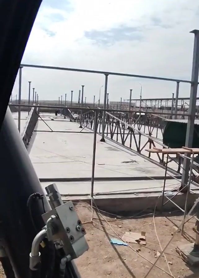 construction site from the perspective of a crane operator. The crane's boom is extending upwards and its cable is visible. Below, a large concrete pad forms the base of the site. Numerous steel support structures, including pillars and crossbeams, are being assembled. In the background, a power line tower is visible against a partly cloudy sky. Workers are present on the construction site, moving around the framework. The ground around the concrete pad is dirt.