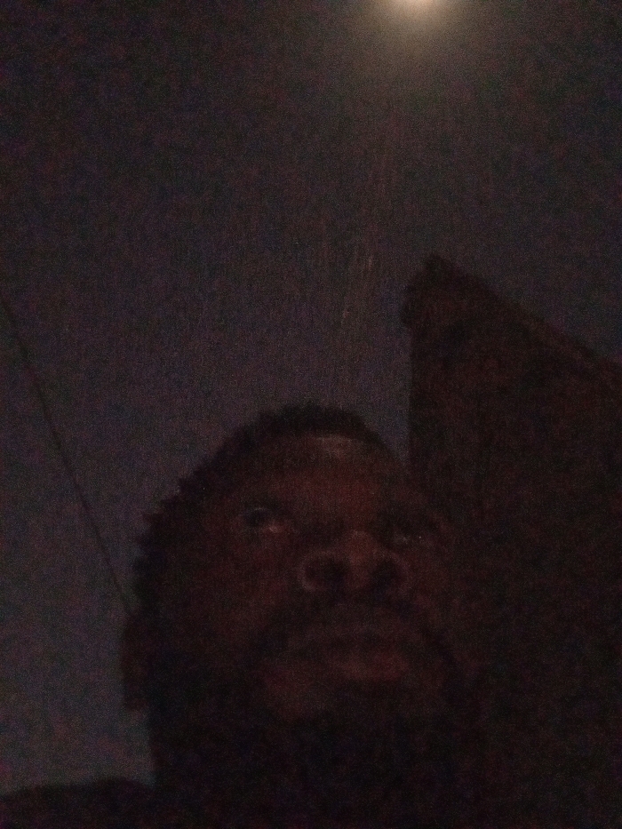 A close-up, low-angle shot captures a person's face against a dark, grainy background. The lighting is dim, obscuring details and casting the face in shadow. A faint light source, possibly the moon, is visible in the upper portion of the frame. The person's expression is neutral. A dark, undefined shape appears behind them. Overall, the image has a somber and mysterious quality due to the limited visibility.