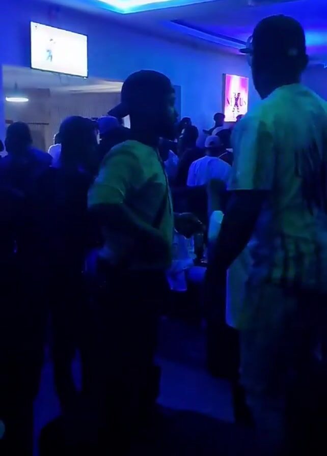 The video depicts an indoor scene with multiple people in a dimly lit room, possibly a club or a lounge, illuminated by blue and purple lights