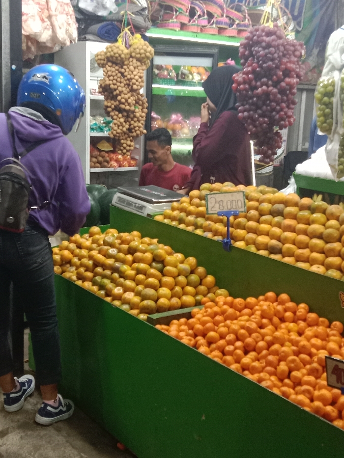 The image depicts an active fruit stall in a market located in Sekopek Wetan, Indonesia