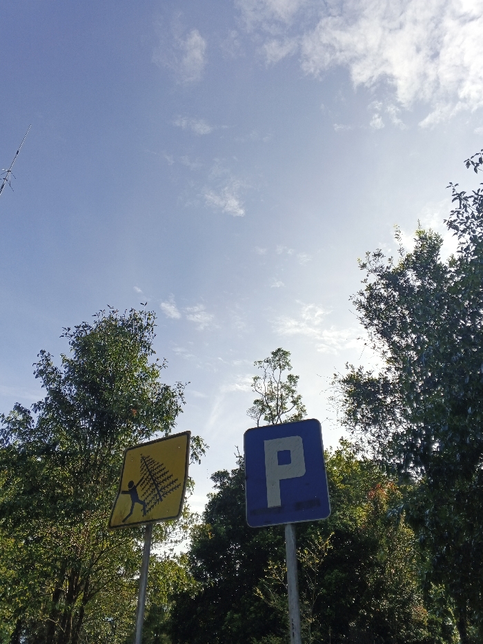 Beneath a bright, pale blue sky speckled with thin clouds, two signs stand amidst lush green trees. On the left, a yellow sign warns of a man carrying a tree. To the right, a blue sign with a white "P" indicates parking. The signs are weathered, adding character to the scene. Trees surround the signs, giving the photo a natural frame. The sun's light is filtering through the foliage and the sky creating a peaceful and serene outdoor setting.