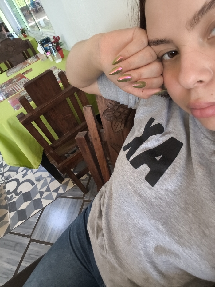 An adult female is depicted in a close-up, high-angle selfie taken indoors in Santa Ana, Venezuela. The individual is positioned with her torso and head filling the right side of the frame, her gaze directed towards the camera. Her right arm is bent, and her right hand rests near her cheek, fingers slightly curled. Her fingernails are long, almond-shaped, and coated in an iridescent polish that shifts between green and pink/gold. She is wearing a light grey short-sleeved t-shirt with partial black block lettering, possibly "YA" or "AY," visible on the right shoulder. Blue denim jeans are visible below her t-shirt. The background, predominantly on the left, reveals a casual indoor setting. The floor consists of two distinct tiled patterns: a geometric black, white, and grey isometric cube design, and an adjacent section of grey, possibly marbleized, square tiles. Dark wooden chairs are visible, including one with an elaborately carved backrest. A table covered with a bright lime-green tablecloth holds various items, including small bottles and a decorative red berry branch. A white wall is visible behind the table, with an out-of-focus area beyond, suggesting a window or doorway leading to an outdoor view with foliage.