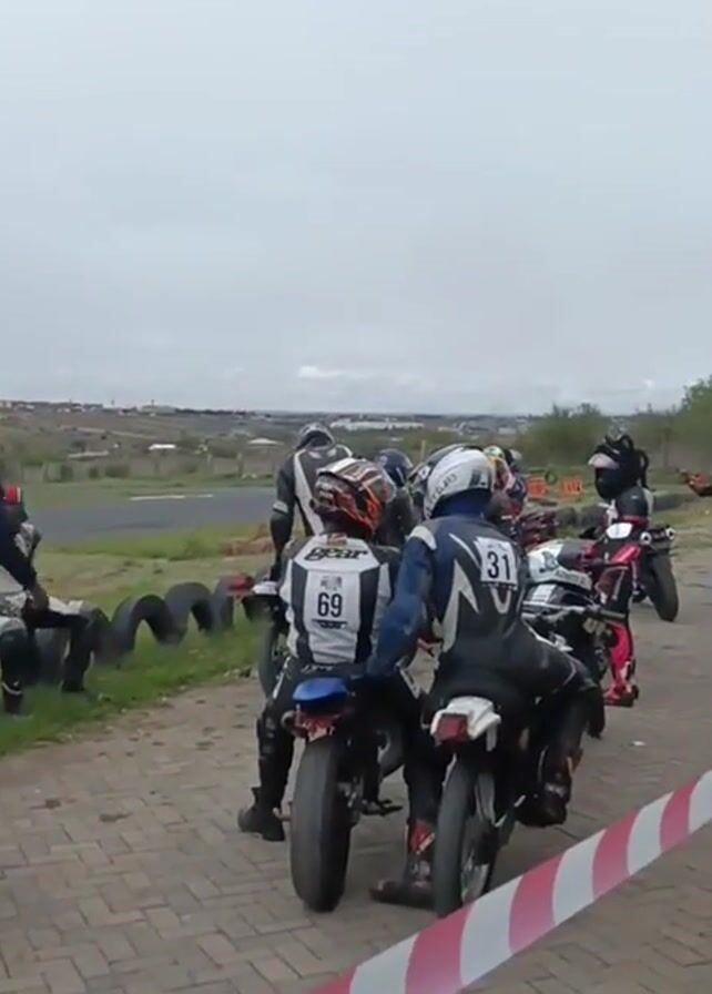 group of motorcyclists, likely racers, lined up on a paved area near a track. Most are on their bikes, wearing full racing leathers and helmets. Numbers are visible on some of their gear, including "69" and "31." A security guard wearing a yellow vest stands near a pile of tires on the left side of the frame. A few other people are standing around, seemingly observers. The track is visible in the background, with a few buildings on the horizon. Red and white striped tape mark a boundary line in the foreground. The sky is overcast.