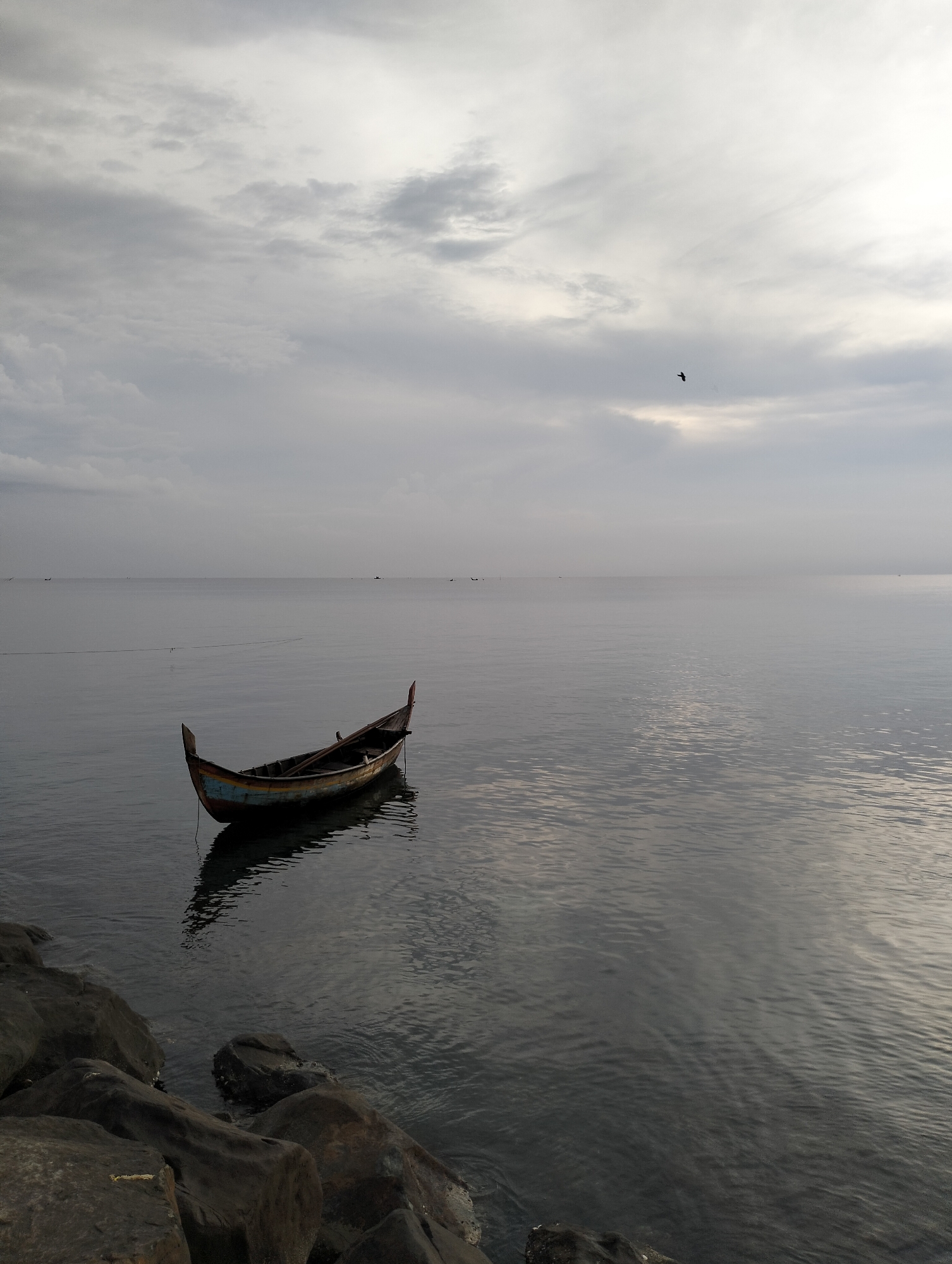 The image depicts a calm body of water, likely a bay or harbor, under an overcast sky in Lhokseumawe, Indonesia. A small, weathered wooden boat with a pointed bow and stern sits near a rocky shoreline in the foreground. The boat's hull is painted in muted shades of blue, yellow, and brown. Small boats are visible in the distance. A single bird flies in the sky. The water is relatively still, reflecting the overcast sky and creating a muted gray tone. Rocks are visible along the lower left of the frame.