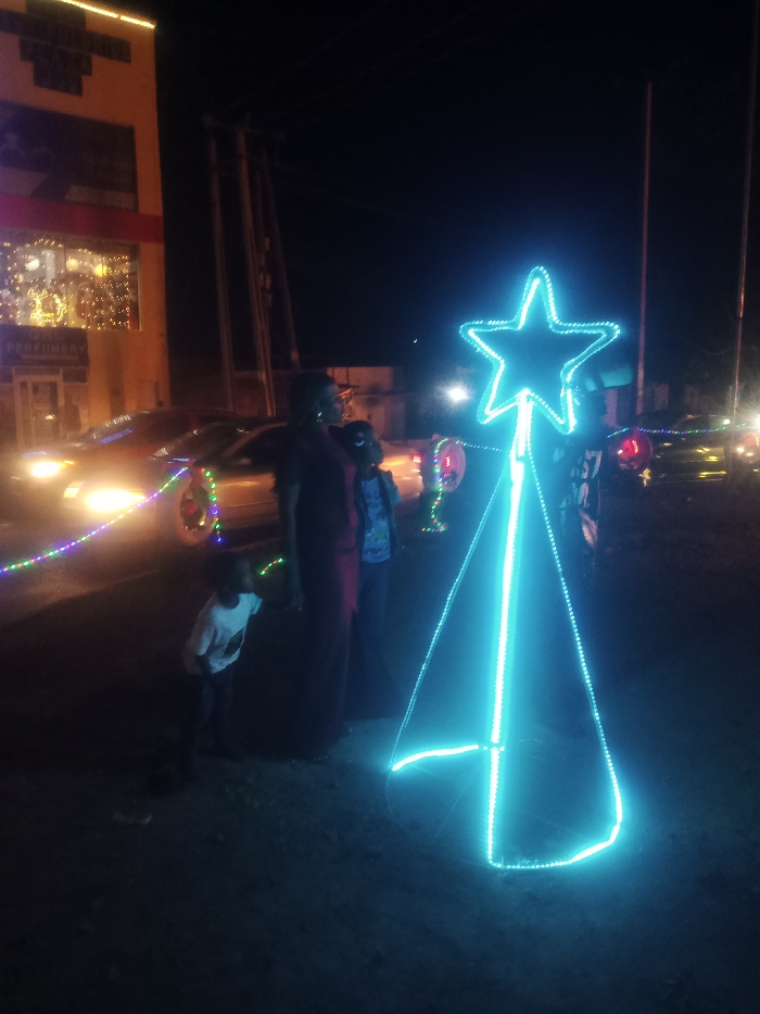 - "A nighttime scene shows a family of four standing near a light-up Christmas tree shaped like a star" by FM-dlThU2, licensed under CC BY 4.0