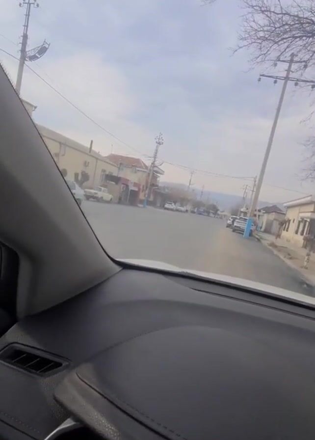The video is taken from the dashboard of a car driving down a straight street