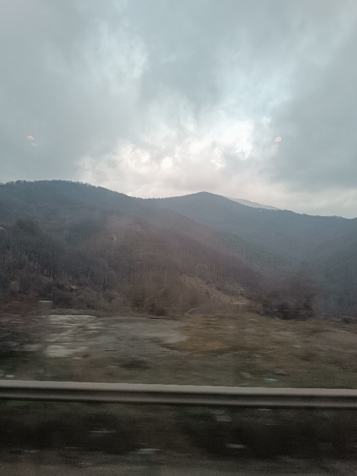 This image captures a landscape scene in Vrachesh, Bulgaria, under overcast conditions during daylight. The upper half of the frame is filled with a dense, grey cloud layer, revealing a brighter, diffused light source towards the upper right. Two ovoid light reflections are present in the upper left and right portions of the sky. The middle ground consists of multiple layers of dark, forested mountains, appearing predominantly barren of leaves, suggesting late autumn or winter. On the lower slope of the leftmost mountain, a small structure with reddish-brown walls and a dark roof is partially visible. The lower foreground presents a relatively flat expanse of mixed dull green vegetation and wet, muddy brown ground. A dark grey, metallic two-bar road barrier extends horizontally across the lower fifth of the image, exhibiting slight motion blur. No individuals are present.