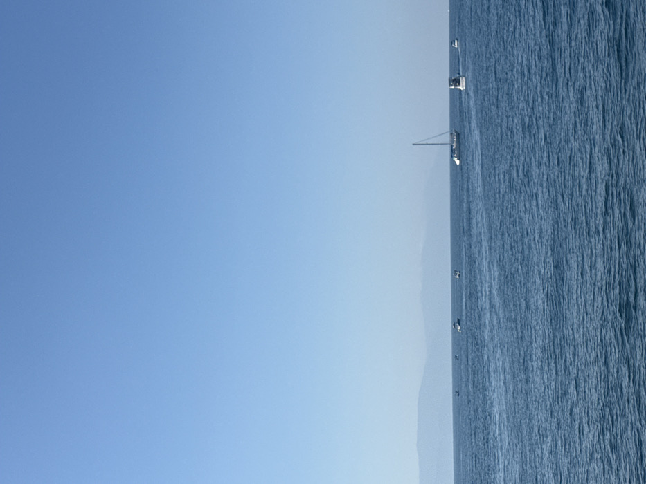 A bright blue sky dominates the left side of the image, fading into a light haze near the horizon. A body of water, possibly an ocean or a large lake, fills the right side, its surface textured with ripples and waves. Several sailboats, distinguishable by their masts and sails, dot the horizon. The image is rotated such that the sky is on the left and the water is on the right.