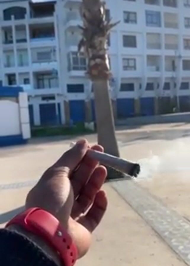 A hand holds a lit cigarette in front of a palm tree and a multi-story building on a sunny day