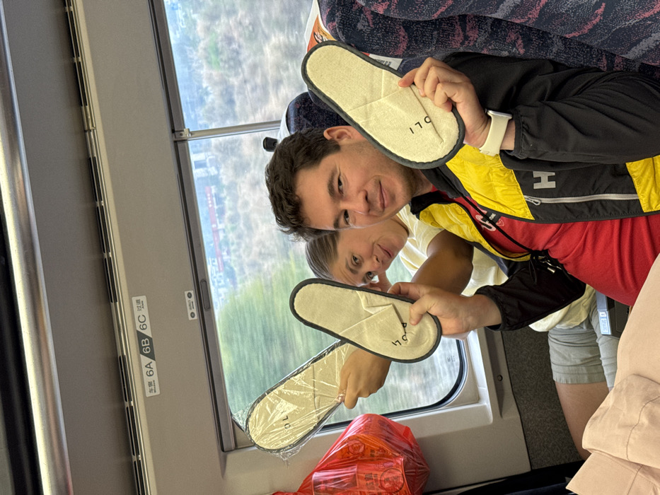 The scene depicts two adults, a male and a female, seated inside a modern train carriage, specifically near seats labeled 6A, 6B, and 6C. The train is presumed to be in the region of Guilin, China, based on the prompt. The male, positioned in the foreground and to the right, has dark hair, is wearing a red t-shirt beneath a black and yellow jacket with a "Helly Hansen" (HH) logo, and a light-colored smartwatch on his left wrist. He holds two cream-colored, disposable-style slippers with dark trim, one in each hand, facing the camera. The word "OLI" is visible on the sole of the slipper in his right hand. The female is seated behind and to the left of the male, with light brown hair, wearing a light-colored t-shirt and light shorts. She holds two identical slippers in her left hand; one is still enclosed in clear plastic packaging, also bearing the "OLI" mark. Both individuals are looking directly at the camera with slight smiles. The train interior features light gray overhead panels and dark blue patterned fabric seats. Through the window to the left, a blurred view of green foliage, distant structures, and a hazy sky suggests the train is in motion through a landscape. A red plastic bag containing an unidentifiable object is hanging by the window near the female.
