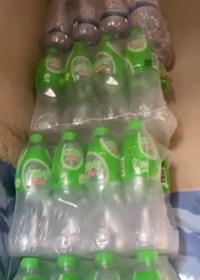 A stack of unopened, plastic-wrapped packs of green soft drink bottles is visible