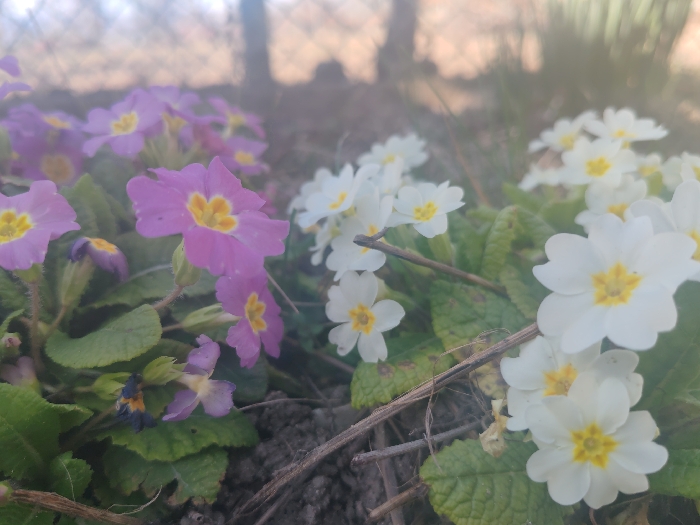 The image displays a close-up ground-level view of flowering plants in Resilovo, Bulgaria, under soft, somewhat hazy light conditions. The foreground features two distinct clusters of primrose-type flowers. On the left, approximately five to seven purple (or magenta) flowers with prominent yellow centers are visible, surrounded by their dark green, textured leaves. To the right, a denser group of white flowers, also with distinct yellow centers, grows amidst similar green foliage. Several small, dry brown twigs or stems are scattered on the dark soil between and around the flower clusters. The background is significantly out of focus, showing blurred shapes consistent with a light-colored wire fence and indistinct vegetation or trees. No human subjects or animals are present.