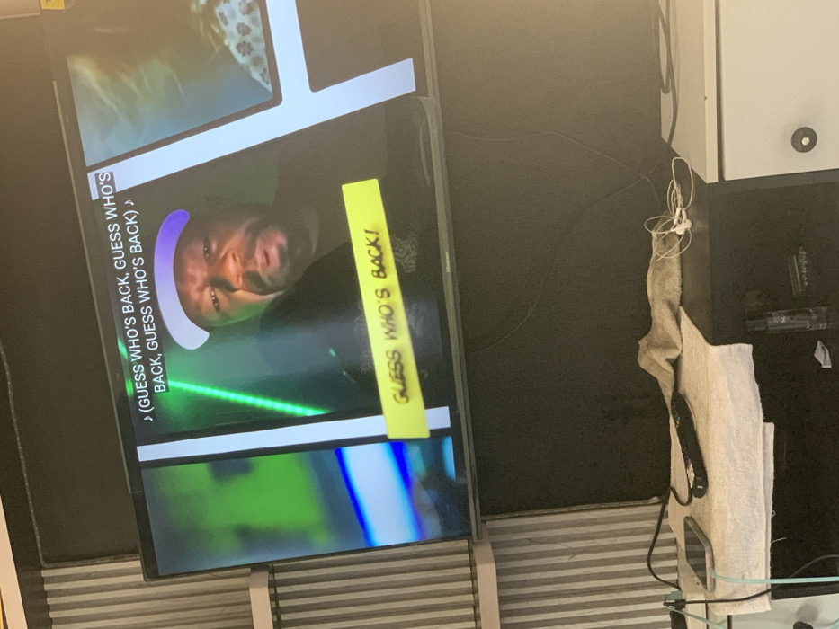 This image depicts an indoor scene in the city of Barakin Lerawi, Nigeria, featuring a television and a shelf with various items. A black flat-screen Hisense television is mounted or placed against a dark wall, displaying video content. The screen shows a male individual, appearing to be Curtis Jackson (50 Cent), wearing a dark shirt and a light purple cap, looking directly forward. On-screen captions are visible: "(GUESS WHO'S BACK, GUESS WHO'S BACK, GUESS WHO'S BACK)" at the top and "GUESS WHO'S BACK!" within a yellow bar at the bottom. The video also shows a vertical green light effect and a partial view of another figure or element on the far right. To the left of the TV, a wall or paneling with vertical light and dark gray stripes is visible. Below the television, a dark-colored shelf or cabinet surface is partially covered by a white, folded towel. On this towel, a silver-backed smartphone is placed, connected by a light blue charging cable. Adjacent to the phone is a black remote control. Further to the right, a tangled pair of white wired earphones rests on the towel/shelf. Below the shelf, on a lower compartment, a small clear bottle, possibly containing liquid, stands near some small white pieces of paper or tissue. To the far right, part of a white cabinet with a black circular knob is visible.