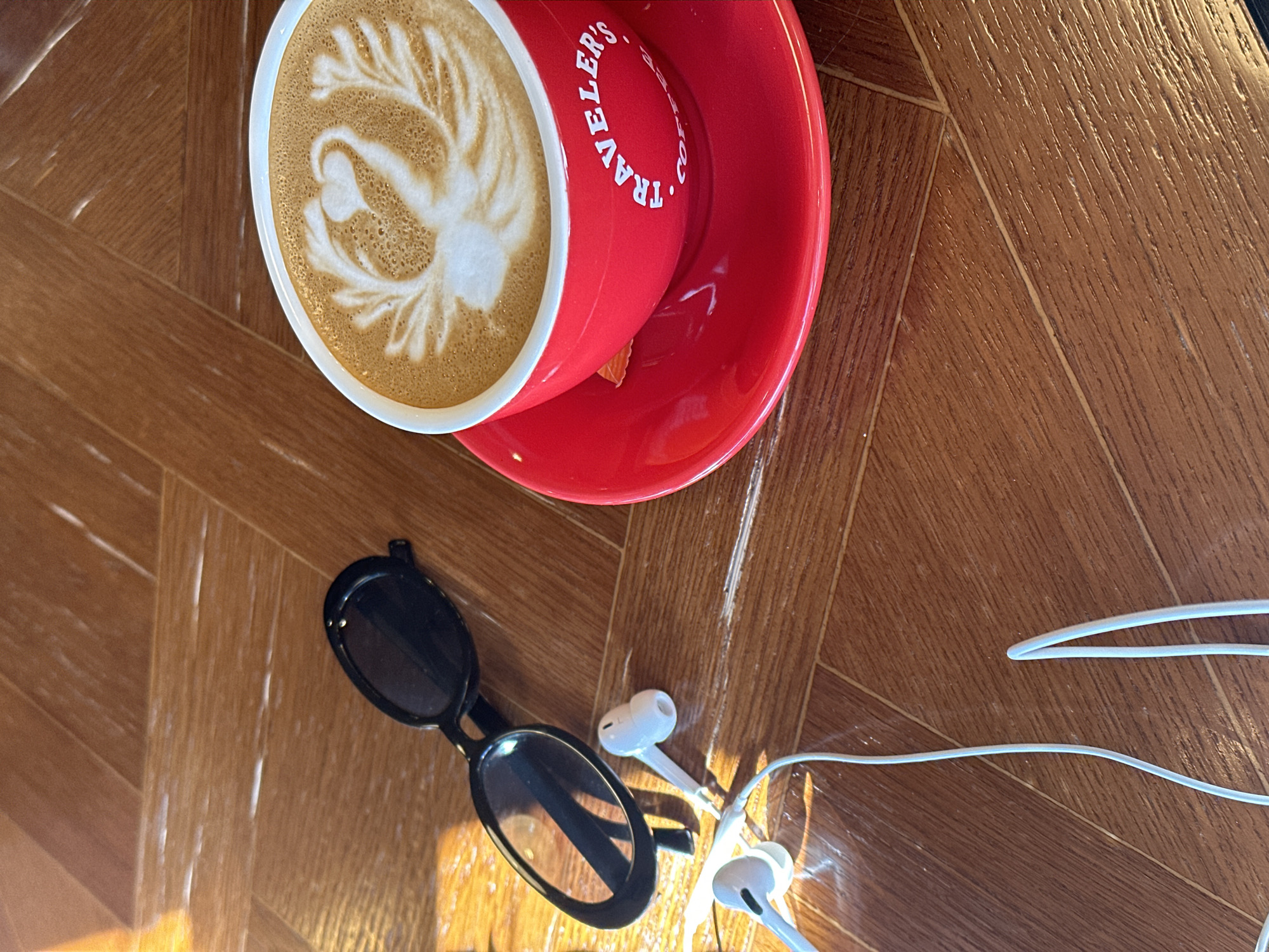 red cup of coffee with latte art on a red saucer, black sunglasses, and white wired earbuds on a wooden parquet surface