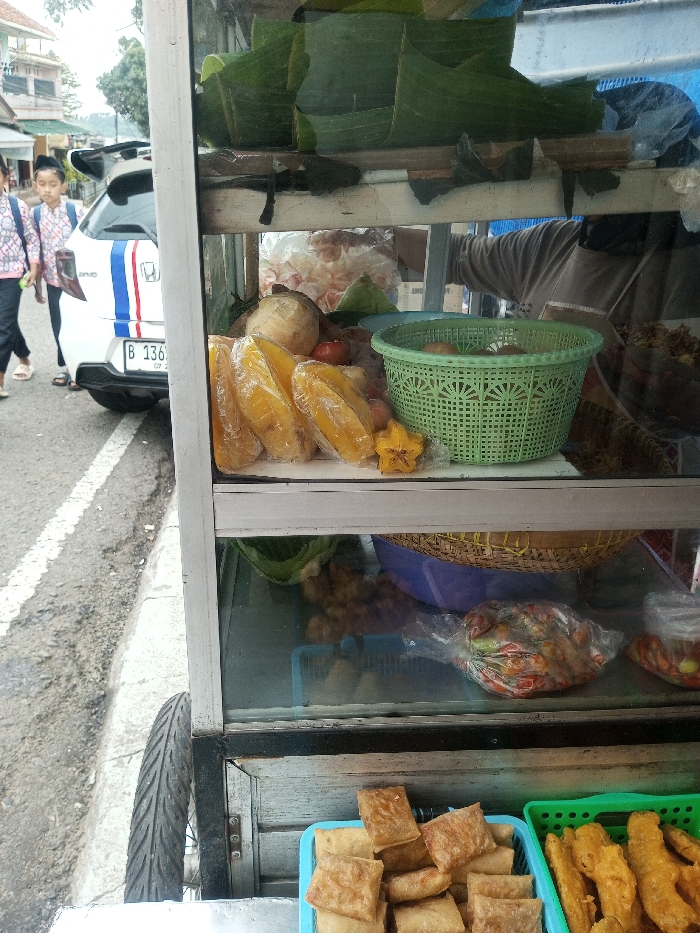 A food cart displays an assortment of wrapped food in banana leaves on the top shelf. Below, star fruits and other fruits are visible. The middle shelf contains snacks and a woven bowl. The bottom shelf showcases fried food in blue and green containers. A white car with blue and red stripes and the plate number "B 136" is parked nearby. Two girls in matching outfits walk on the sidewalk next to the cart.