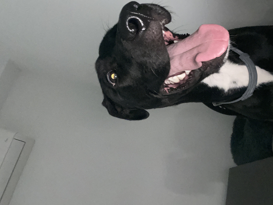 The image presents an indoor scene, presumed to be within a residence in Paiporta, Spain. A medium-to-large-sized black canine with a white chest blaze dominates the foreground, positioned off-center to the right. The dog faces slightly upward and towards the viewer, with its mouth wide open, revealing a fully extended pink tongue and white teeth, indicative of panting. Its eyes show a distinct yellowish reflection, suggesting direct light exposure. A grey, flat-band collar with a wider central section is secured around the dog's neck. The background consists primarily of a plain light-colored wall. In the upper left corner, a white wall-mounted air conditioning unit is partially visible. A dark, indeterminate object, possibly furniture, is partially visible in the lower left portion of the frame. No human subjects are present.