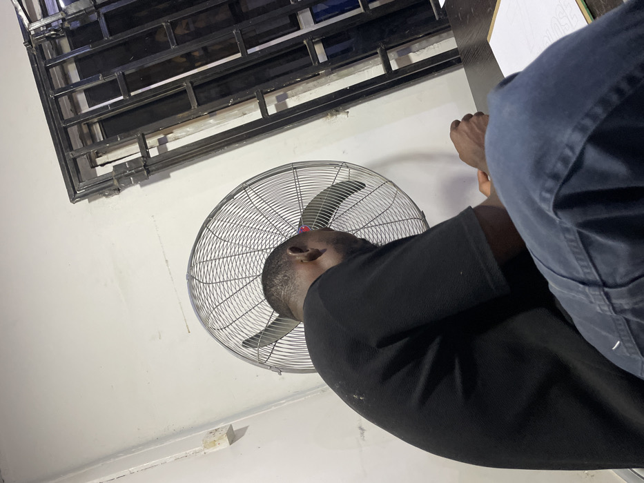 A man looks up at a gray, oscillating fan mounted on a white wall. Above the fan is a black, barred window. The man wears a black t-shirt and blue pants, with his arm and hand visible near a desk with a white paper on it. The camera's perspective is angled upwards, capturing the scene from a lower viewpoint. The lighting is dim, creating shadows in the image.