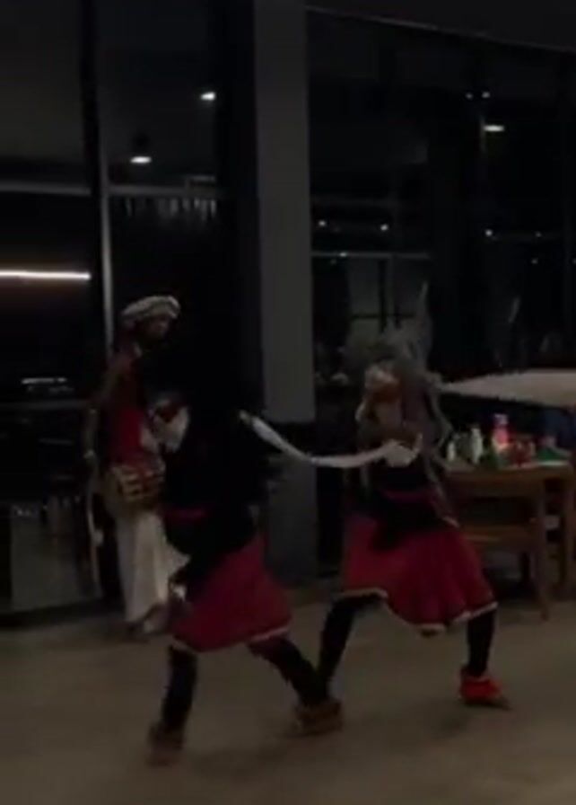 A video shows a group of four performers in a large, dimly-lit room with modern décor, which includes large windows. Two of the performers are drummers, dressed in traditional white garb and hats with red accents. They play small drums that are slung around their necks. The other two performers, presumably dancers, are dressed in black tops and red skirts. They dance, moving in a frenetic manner and spinning. One of the dancers wears a mask and has long white cloths in their hands. The dance is performed on a beige tile floor, and there are tables and chairs in the background. The scene appears to be a cultural performance at a restaurant or event.