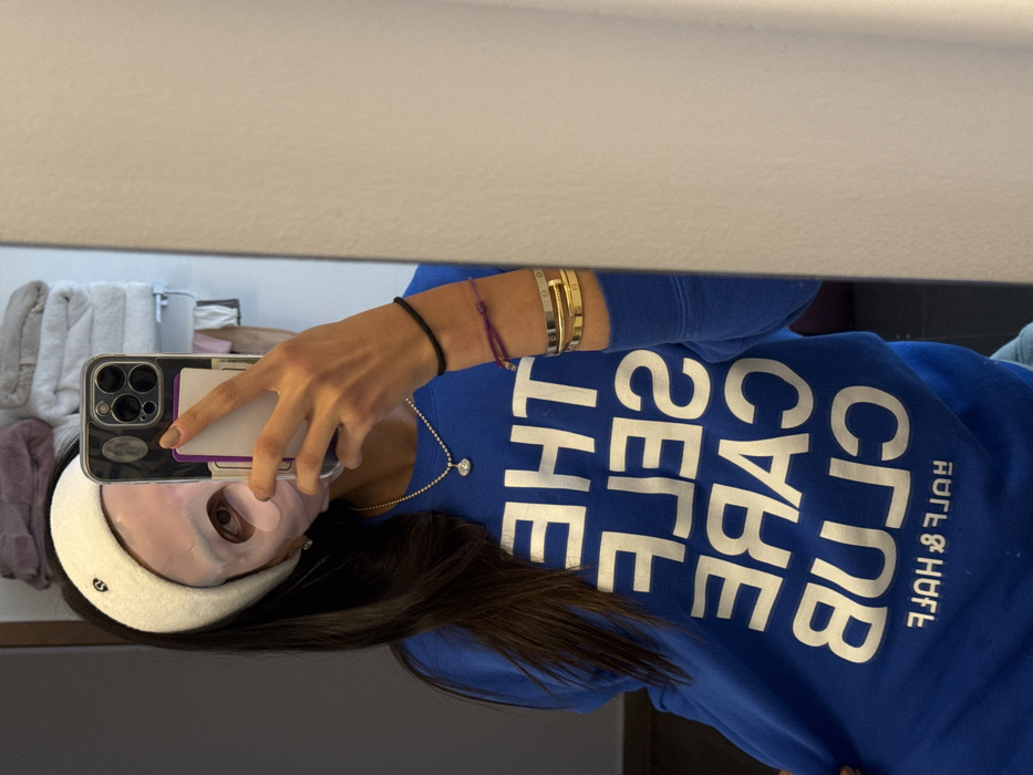A person is seen taking a selfie in a mirror, wearing a white headband, face mask, and a blue sweatshirt with the words "THE SELF CARE CLUB HALE & HUFF" printed in large white letters. They are holding a smartphone in their hand, which obscures part of their face. The image is taken indoors, possibly in a bathroom. Towels and a water bottle are reflected in the mirror. They are also wearing multiple bracelets on their wrist.
