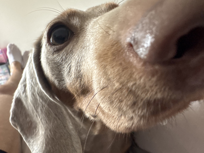A close-up image focuses on the head of a short-haired dog, likely a Dachshund or similar breed, characterized by light brown and tan fur. The dog's left eye is prominent, appearing dark and round with a visible pupil, reflecting ambient light. Several thin, light-colored whiskers extend from the muzzle area. The dark, moist-looking nose is centered towards the right foreground, showing the right nostril. A faint, reddish texture or mark is visible on the upper bridge of the nose. Part of a light greyish-tan, droopy ear flap is visible on the left side of the dog's head. The dog's gaze is directed towards the viewer. In the blurred background to the left, a human leg wearing a white sock is visible, positioned horizontally. Beyond this, indistinct colorful shapes are discernible, suggesting items within a room. The upper left background is a plain, light-colored surface. The right side of the frame features a darker, out-of-focus area. The overall environment is an indoor, domestic setting. Visual elements within the image do not provide specific landmarks or identifying features to establish a precise location within the city of Warsaw, Poland.