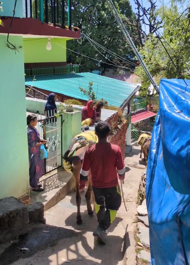 A low angle shot captures a narrow, sloped pathway cutting through a residential area. The path is concrete, and buildings flank both sides. On the left, a green building with a red trim is visible, with a blue-clad woman standing near a green gate. Further up the path, three other women are seen. On the right, a large blue tarp covers something, obscuring the view beyond. A man in a red shirt and dark pants walks up the path, guiding a line of donkeys. He holds a long walking stick. The donkeys are carrying some kind of loads on their backs. The scene takes place on a sunny day, as evidenced by the bright lighting and visible shadows.