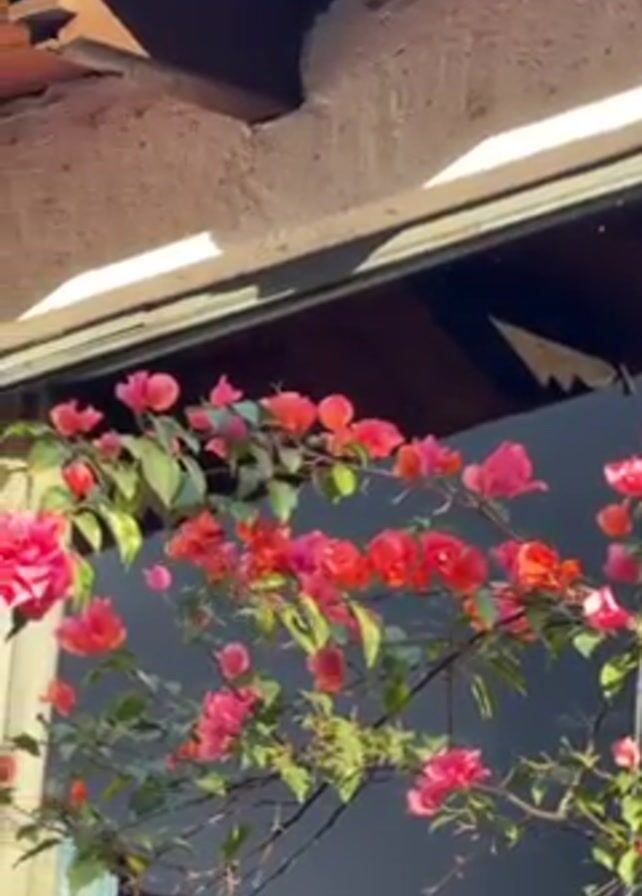 The camera is pointed up towards a building with a red tile roof. The edge of the roof is visible. Under the roof is a black surface with a window. In front of the window are several branches of a plant with pink and red flowers and green leaves. The plant covers most of the window and the branches sway slightly in the wind.