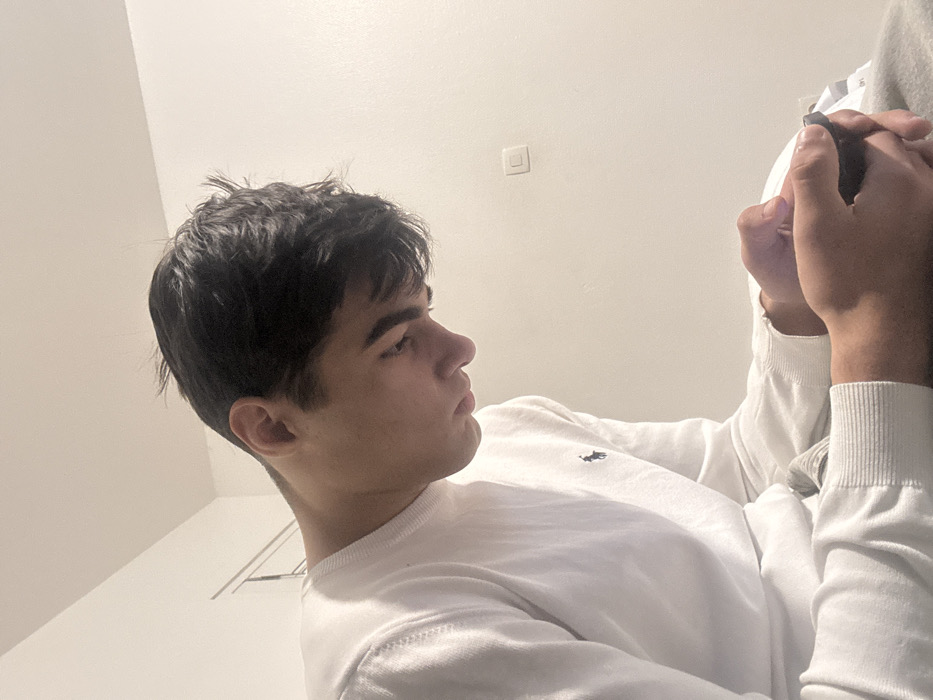 The scene is set indoors in the city of Ostwald, France. A young male with dark, tousled hair and fair skin is depicted from the upper torso, seated with his head lowered and eyes focused downwards. He is holding a dark-colored electronic device, likely a smartphone, horizontally in both hands. A faint light emanates from the device's screen. The individual is dressed in a white long-sleeved crew-neck sweater that features a small, dark embroidered polo horse logo on the left chest. His forearms and hands rest upon a light grey fabric, possibly a blanket. The background consists of plain, light-colored walls. A light-colored rectangular electrical wall switch with a square central element is affixed to the wall on the right side of the frame. A partial view of a vertical structural element, potentially a door frame, is visible on the far left.