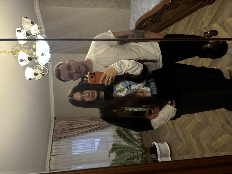 The image displays two individuals, a female and a male, captured in a mirror selfie within a residential room located in Vysokinichi, Russia