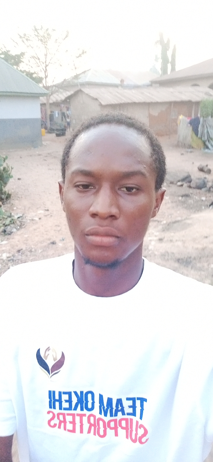 A young man poses for a selfie outdoors. He has short, dark hair and wears a white t-shirt with a blue and pink logo and text that reads "TEAM OKEHI SUPPORTERS" reversed. Background shows a dirt yard with weathered buildings. The lighting appears bright, possibly from sunlight, creating a somewhat overexposed effect. The environment looks rural and simple.